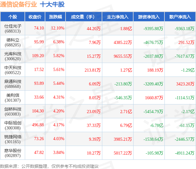 个股表现方面,通信设备行业当日领涨股为仕佳光子(688313),该股当日报收74.1,上涨12.1%,成交量44.2万,主力资金净流入1.88亿元。德科立(688205)以上涨6.38%紧随其后,该股当日成交量7.96万,主力资金净流入4385.22万元。除此之外,光库科技(300620)、中天科技(600522)、鼎通科技(688668)均进入当日牛股之列。具体个股列表见下表: