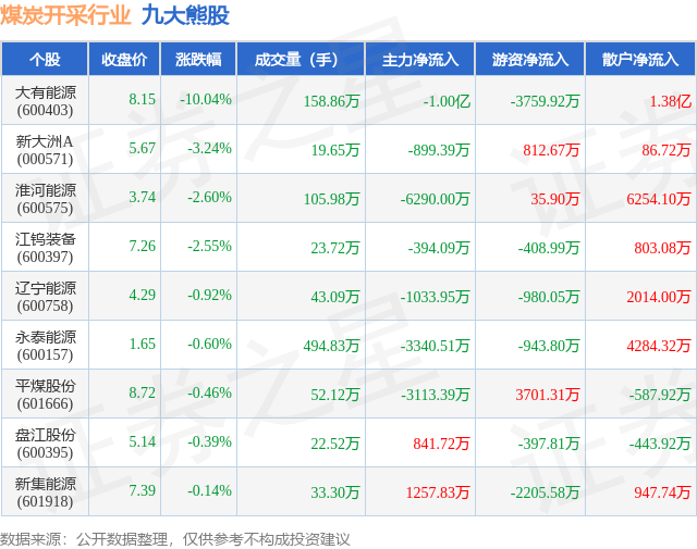 个股表现方面,煤炭开采行业当日领跌股为大有能源(600403),该股当日报收8.15,下跌10.04%,成交量158.86万,主力资金净流出1.0亿元。新大洲A(000571)以下跌3.24%紧随其后,该股当日成交量19.65万,主力资金净流出899.39万元。除此之外,淮河能源(600575)、江钨装备(600397)、辽宁能源(600758)均进入当日熊股之列。具体个股列表见下表: