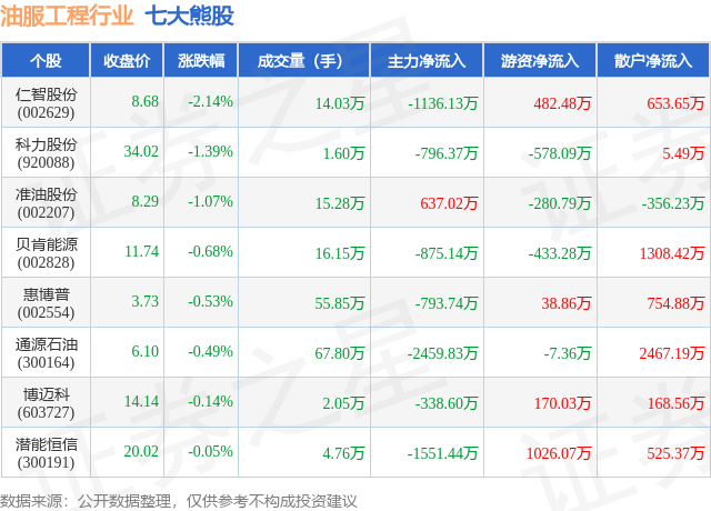 个股表现方面,油服工程行业当日领跌股为仁智股份(002629),该股当日报收8.68,下跌2.14%,成交量14.03万,主力资金净流出1136.13万元。科力股份(920088)以下跌1.39%紧随其后,该股当日成交量1.6万,主力资金净流出796.37万元。除此之外,准油股份(002207)、贝肯能源(002828)、惠博普(002554)均进入当日熊股之列。具体个股列表见下表: