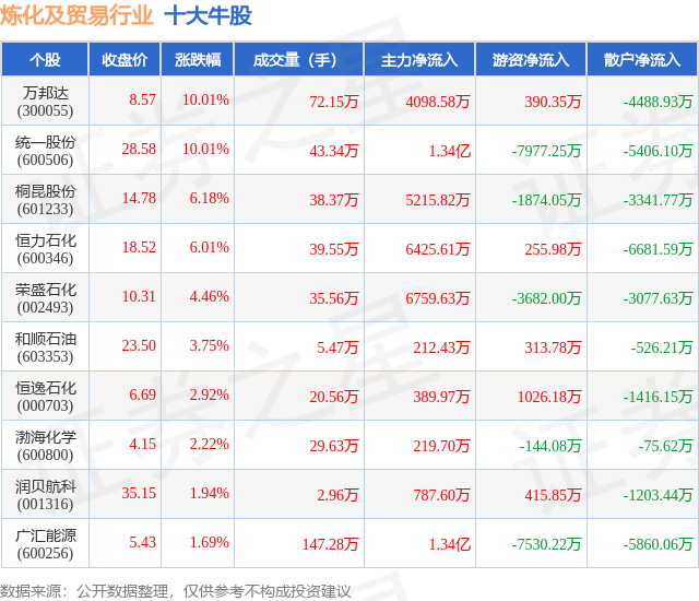 个股表现方面,炼化及贸易行业当日领涨股为万邦达(300055),该股当日报收8.57,上涨10.01%,成交量72.15万,主力资金净流入4098.58万元。统一股份(600506)以上涨10.01%紧随其后,该股当日成交量43.34万,主力资金净流入1.34亿元。除此之外,桐昆股份(601233)、恒力石化(600346)、荣盛石化(002493)均进入当日牛股之列。具体个股列表见下表: