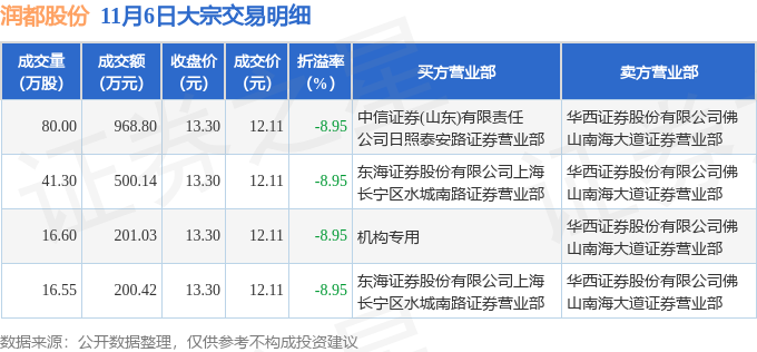 证券之星消息,11月6日润都股份发生大宗交易,交易数据如下: