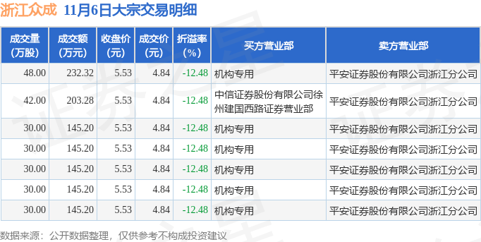 证券之星消息,11月6日浙江众成发生大宗交易,交易数据如下: