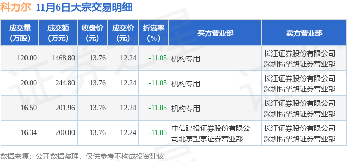 证券之星消息,11月6日科力尔发生大宗交易,交易数据如下: