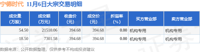 证券之星消息,11月6日宁德时代发生大宗交易,交易数据如下: