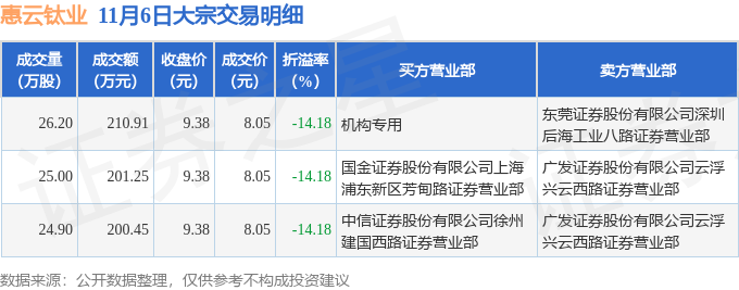 证券之星消息,11月6日惠云钛业发生大宗交易,交易数据如下: