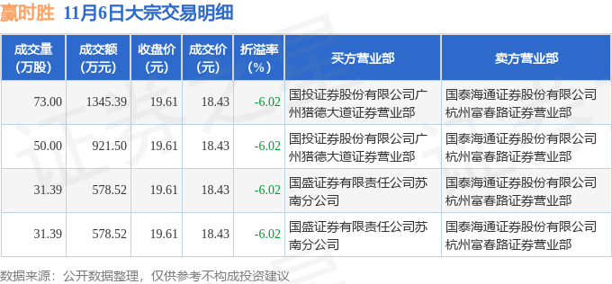 证券之星消息,11月6日赢时胜发生大宗交易,交易数据如下: