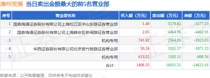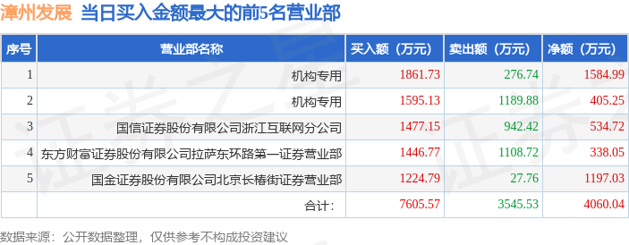 证券之星消息,沪深交易所2025年11月6日公布的交易公开信息显示,漳州发展(000753)因日跌幅偏离值达到7%的前5只证券登上龙虎榜。此次是近5个交易日内第2次上榜。