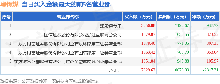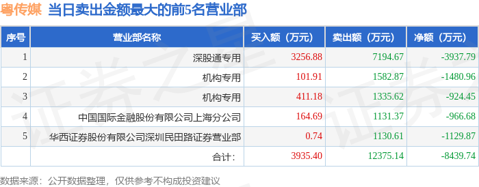 证券之星消息,沪深交易所2025年11月6日公布的交易公开信息显示,粤传媒(002181)因日跌幅偏离值达到7%的前5只证券登上龙虎榜。此次是近5个交易日内第3次上榜。