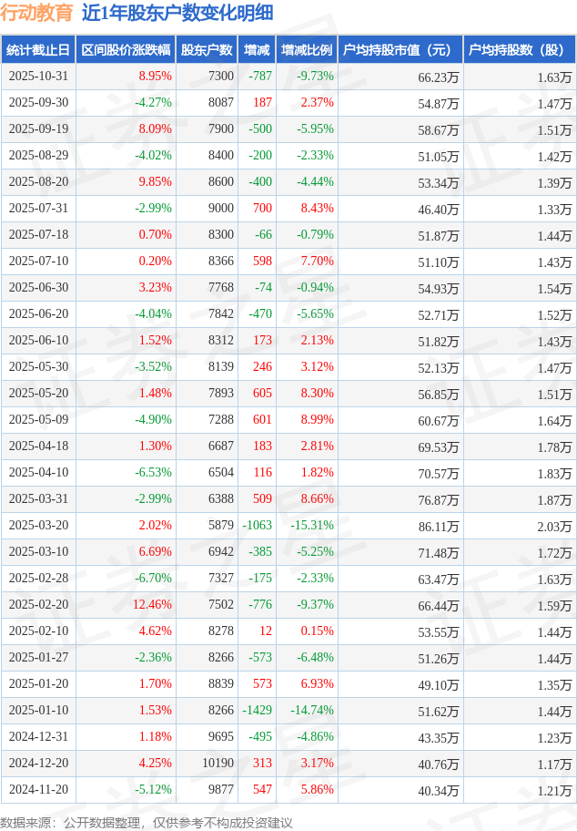 证券之星消息,近日行动教育披露,截至2025年10月31日公司股东户数为7300.0户,较9月30日减少787.0户,减幅为9.73%。户均持股数量由上期的1.47万股增加至1.63万股,户均持股市值为66.23万元。