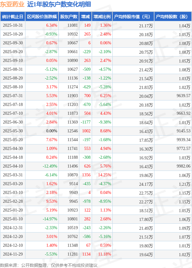 从股价来看,2025年10月20日至2025年10月31日,东亚药业区间涨幅为6.34%,在此期间股东户数增加149.0户,增幅为1.36%。
