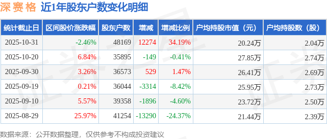 从股价来看,2025年10月20日至2025年10月31日,深 赛 格区间跌幅为2.46%,在此期间股东户数增加1.23万户,增幅为34.19%。