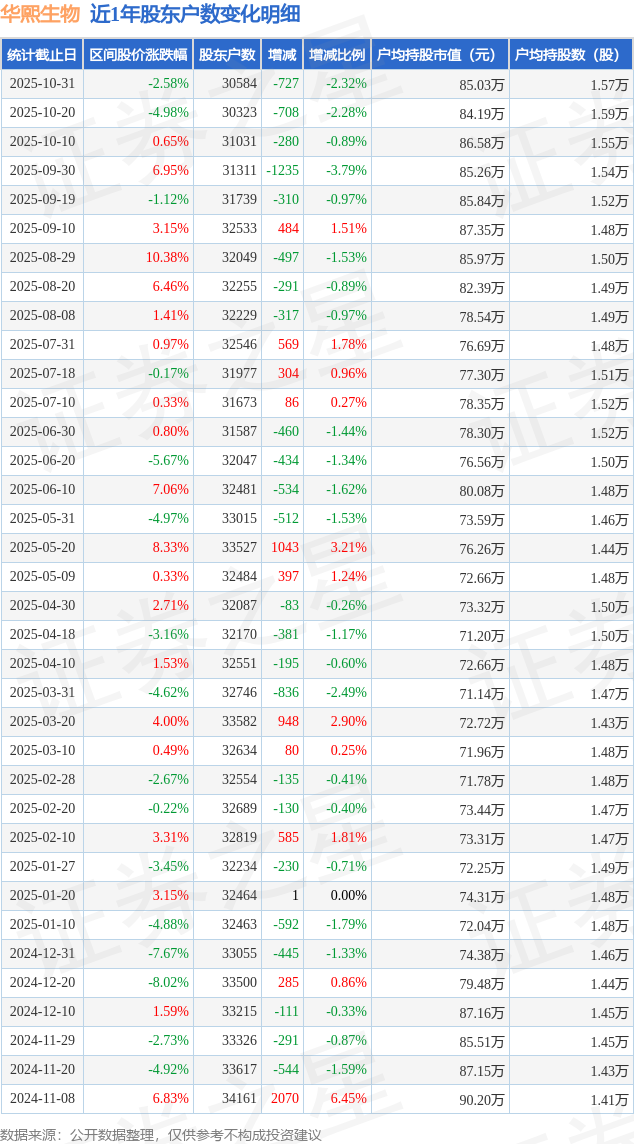 从股价来看,2025年9月30日至2025年10月31日,华熙生物区间跌幅为2.58%,在此期间股东户数减少727.0户,减幅为2.32%。