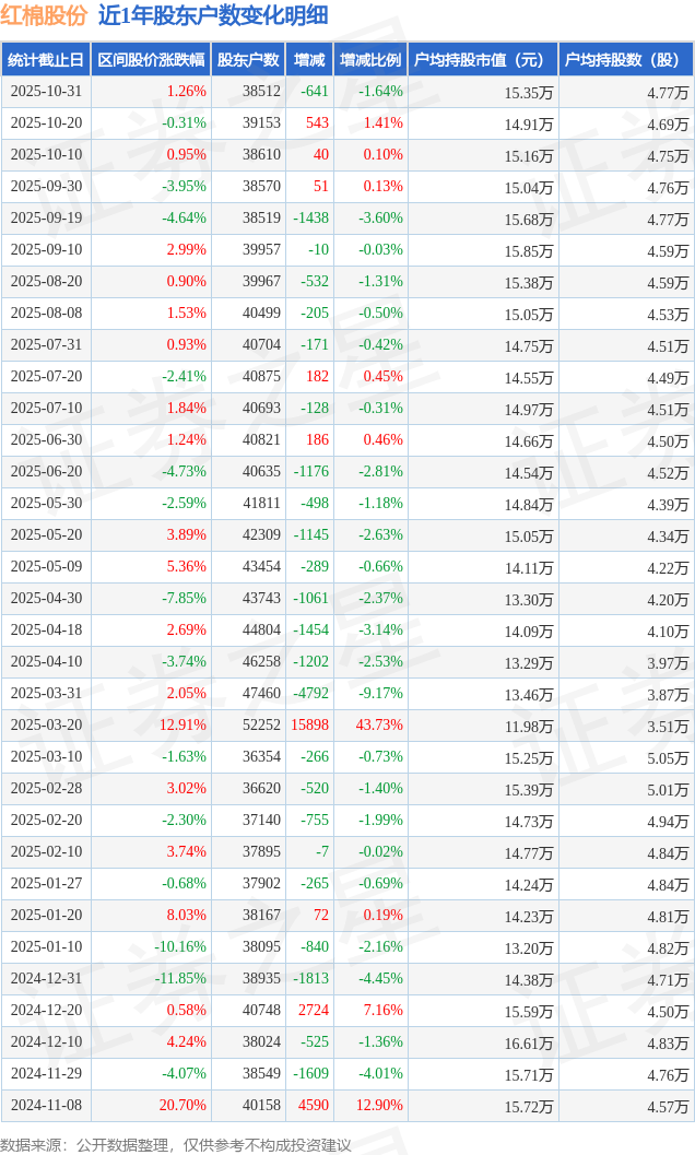从股价来看,2025年10月20日至2025年10月31日,红棉股份区间涨幅为1.26%,在此期间股东户数减少641.0户,减幅为1.64%。