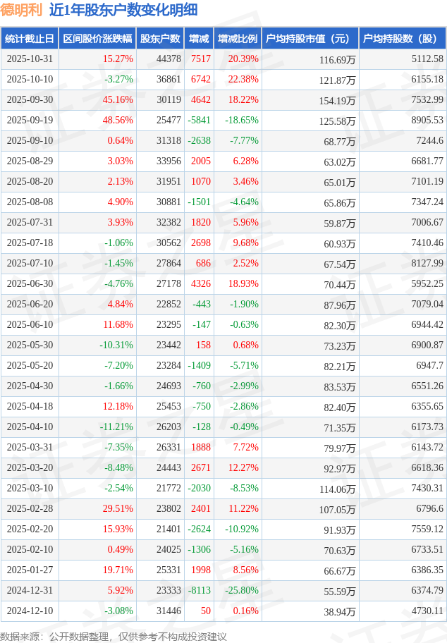 从股价来看,2025年10月10日至2025年10月31日,德明利区间涨幅为15.27%,在此期间股东户数增加7517.0户,增幅为20.39%。