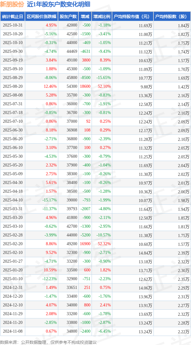 从股价来看,2025年10月20日至2025年10月31日,新朋股份区间涨幅为4.95%,在此期间股东户数减少500.0户,减幅为1.18%。
