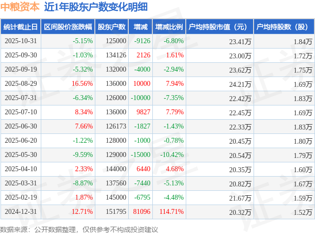从股价来看,2025年9月30日至2025年10月31日,中粮资本区间跌幅为5.15%,在此期间股东户数减少9126.0户,减幅为6.8%。