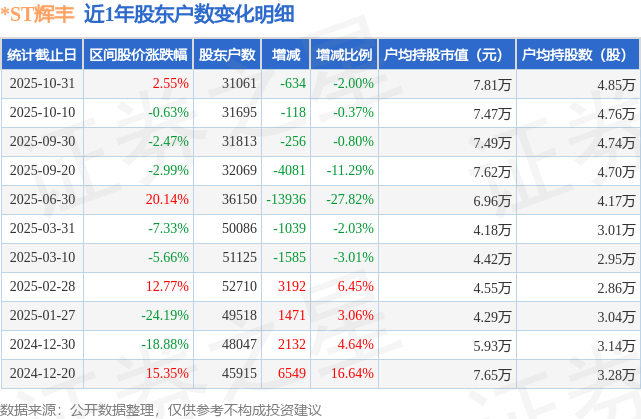 从股价来看,2025年10月10日至2025年10月31日,*ST辉丰区间涨幅为2.55%,在此期间股东户数减少634.0户,减幅为2.0%。