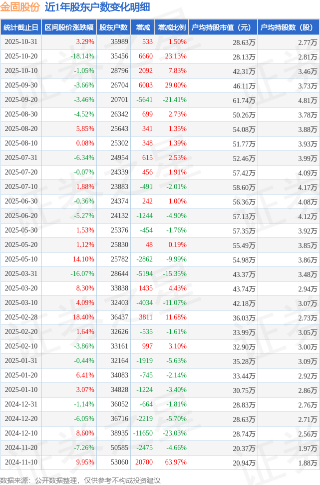 从股价来看,2025年10月20日至2025年10月31日,金固股份区间涨幅为3.29%,在此期间股东户数增加533.0户,增幅为1.5%。