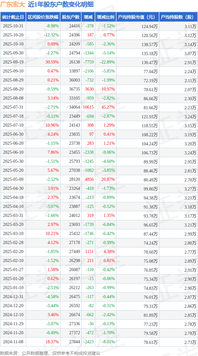 从股价来看,2025年9月30日至2025年10月31日,广东宏大区间跌幅为8.98%,在此期间股东户数减少378.0户,减幅为1.52%。