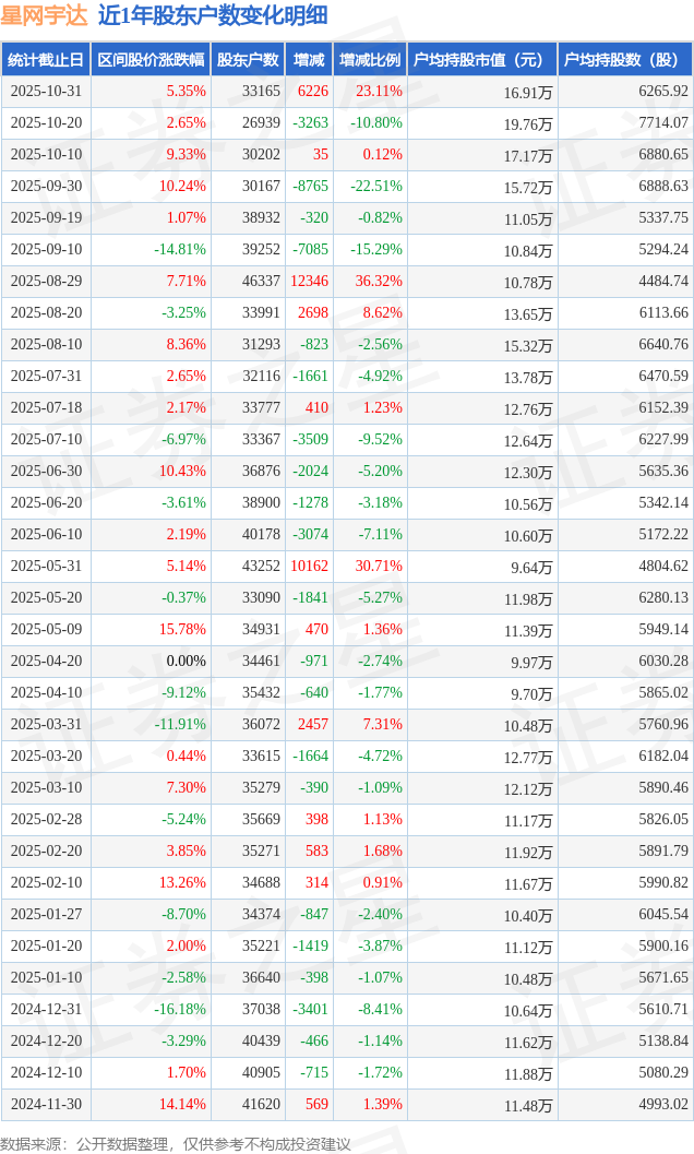 从股价来看,2025年10月20日至2025年10月31日,星网宇达区间涨幅为5.35%,在此期间股东户数增加6226.0户,增幅为23.11%。