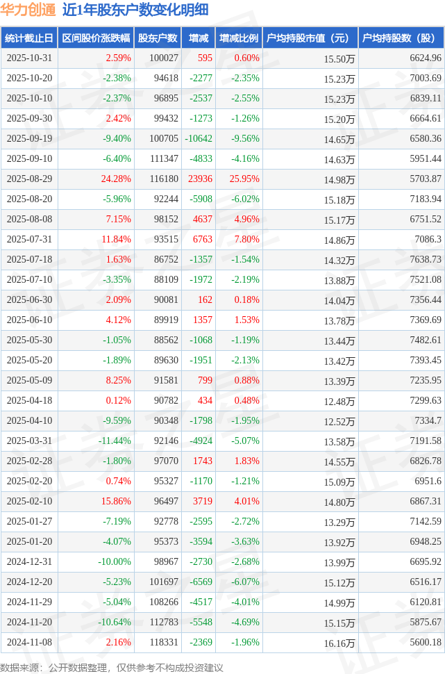 从股价来看,2025年9月30日至2025年10月31日,华力创通区间涨幅为2.59%,在此期间股东户数增加595.0户,增幅为0.6%。