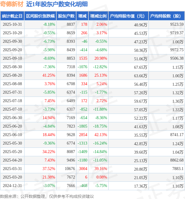 从股价来看,2025年10月20日至2025年10月31日,奇德新材区间跌幅为8.18%,在此期间股东户数增加178.0户,增幅为2.06%。