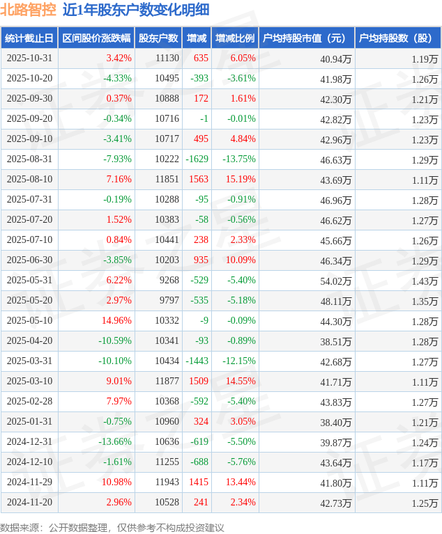 从股价来看,2025年10月20日至2025年10月31日,北路智控区间涨幅为3.42%,在此期间股东户数增加635.0户,增幅为6.05%。