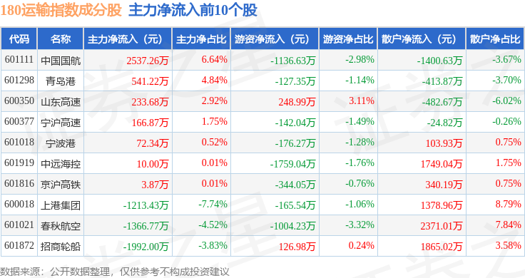 资金流向方面,180运输(000027)指数成份股当日主力资金净流出合计1.54亿元,游资资金净流出合计92.2万元,散户资金净流入合计1.55亿元。成份股资金流向详情见下表: