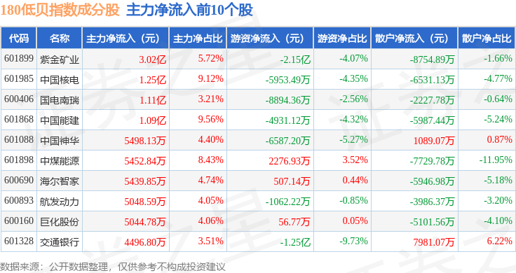 资金流向方面,180低贝(000136)指数成份股当日主力资金净流出合计1283.98万元,游资资金净流出合计6.51亿元,散户资金净流入合计6.64亿元。成份股资金流向详情见下表: