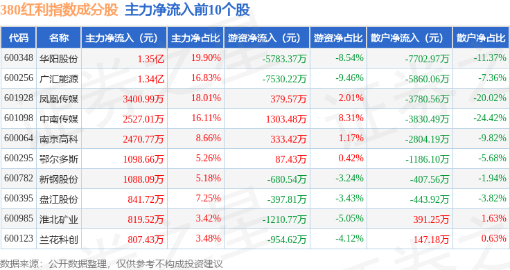 资金流向方面,380红利(000150)指数成份股当日主力资金净流入合计5623.22万元,游资资金净流入合计554.02万元,散户资金净流出合计6177.24万元。成份股资金流向详情见下表: