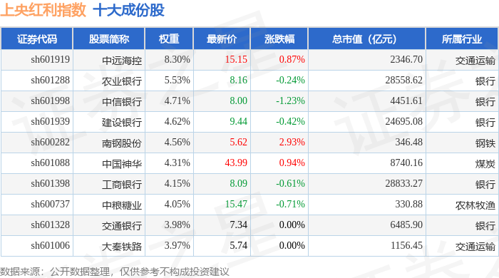 证券之星消息,11月6日,上央红利(000152)指数报收于2966.82点,涨0.33%,成交250.85亿元,换手率0.19%。当日该指数成份股中,上涨的有13家,宝钢股份以3.48%的涨幅领涨,下跌的有13家,亚普股份以1.58%的跌幅领跌。