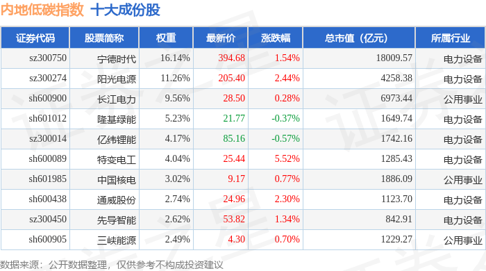 证券之星消息,11月6日,内地低碳(000977)指数报收于2274.34点,涨1.3%,成交1236.65亿元,换手率1.66%。当日该指数成份股中,上涨的有39家,德业股份以6.86%的涨幅领涨,下跌的有11家,天合光能以3.09%的跌幅领跌。