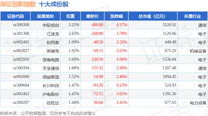 证券之星消息,11月6日,深证创新(399016)指数报收于5724.23点,涨2.02%,成交1653.67亿元,换手率2.61%。当日该指数成份股中,上涨的有84家,麦格米特以10.0%的涨幅领涨,下跌的有16家,航天智造以4.44%的跌幅领跌。