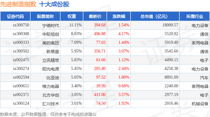 证券之星消息,11月6日,先进制造(399260)指数报收于3815.85点,涨2.26%,成交1667.22亿元,换手率1.45%。当日该指数成份股中,上涨的有42家,潍柴动力以10.01%的涨幅领涨,下跌的有6家,智飞生物以1.47%的跌幅领跌。