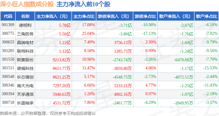 资金流向方面,深小巨人(399268)指数成份股当日主力资金净流入合计16.53亿元,游资资金净流出合计4.17亿元,散户资金净流出合计12.36亿元。成份股资金流向详情见下表: