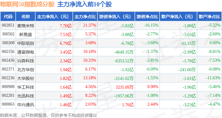 资金流向方面,物联网50(399285)指数成份股当日主力资金净流入合计38.91亿元,游资资金净流出合计19.02亿元,散户资金净流出合计19.9亿元。成份股资金流向详情见下表:
