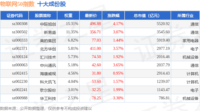 证券之星消息,11月6日,物联网50(399285)指数报收于5943.89点,涨2.39%,成交973.11亿元,换手率2.22%。当日该指数成份股中,上涨的有39家,麦格米特以10.0%的涨幅领涨,下跌的有10家,东华软件以1.45%的跌幅领跌。