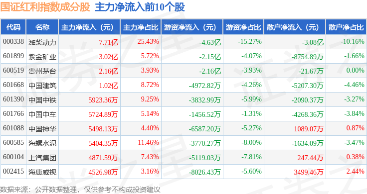 资金流向方面,国证红利(399321)指数成份股当日主力资金净流入合计5.1亿元,游资资金净流出合计12.04亿元,散户资金净流入合计6.94亿元。成份股资金流向详情见下表: