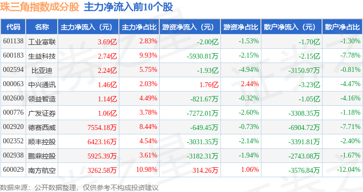 资金流向方面,珠三角(399356)指数成份股当日主力资金净流出合计4.57亿元,游资资金净流入合计5206.29万元,散户资金净流入合计4.05亿元。成份股资金流向详情见下表: