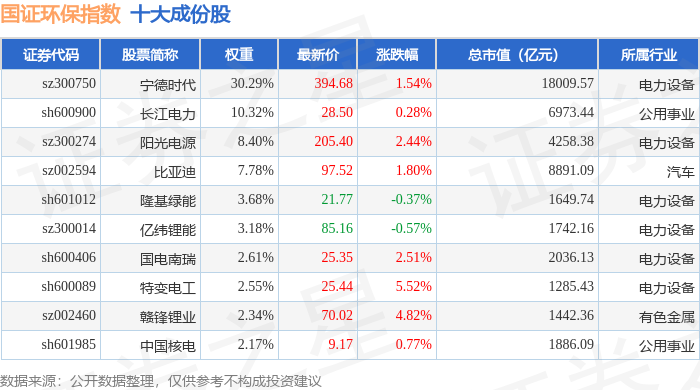 证券之星消息,11月6日,国证环保(399358)指数报收于5902.63点,涨1.56%,成交1303.61亿元,换手率1.77%。当日该指数成份股中,上涨的有30家,正泰电器以10.0%的涨幅领涨,下跌的有9家,天合光能以3.09%的跌幅领跌。