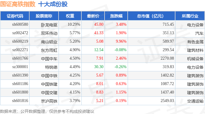 证券之星消息,11月6日,国证高铁(399419)指数报收于2177.39点,涨1.52%,成交200.68亿元,换手率1.2%。当日该指数成份股中,上涨的有31家,通业科技以10.0%的涨幅领涨,下跌的有16家,达实智能以3.91%的跌幅领跌。