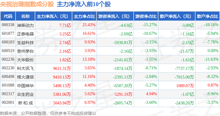 资金流向方面,央视治理(399554)指数成份股当日主力资金净流入合计14.14亿元,游资资金净流出合计10.2亿元,散户资金净流出合计3.95亿元。成份股资金流向详情见下表: