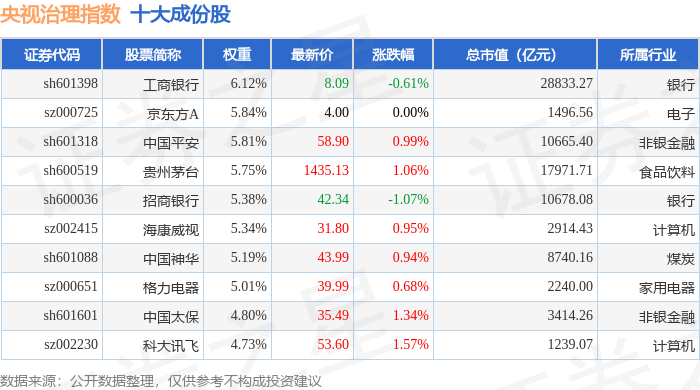 央视治理(399554)指数十大成份股详情如下: