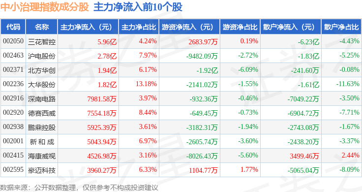 资金流向方面,中小治理(399650)指数成份股当日主力资金净流入合计6.62亿元,游资资金净流出合计3.66亿元,散户资金净流出合计2.96亿元。成份股资金流向详情见下表: