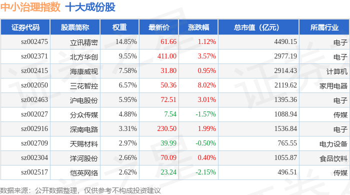 证券之星消息,11月6日,中小治理(399650)指数报收于2618.36点,涨1.72%,成交520.91亿元,换手率1.47%。当日该指数成份股中,上涨的有36家,三花智控以8.02%的涨幅领涨,下跌的有13家,恺英网络以2.15%的跌幅领跌。