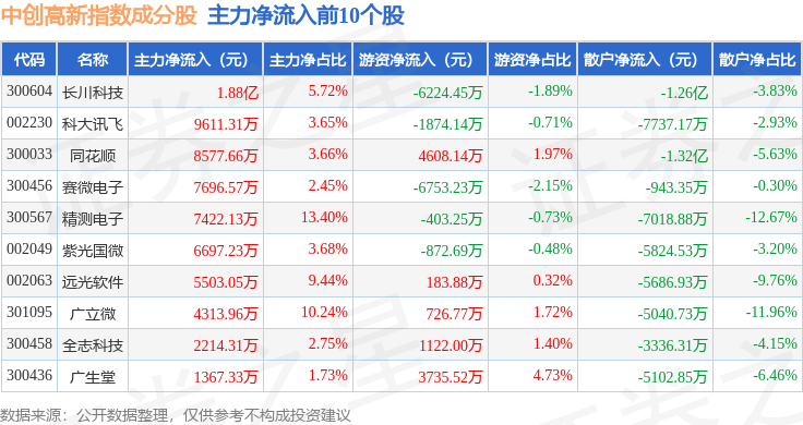 资金流向方面,中创高新(399652)指数成份股当日主力资金净流入合计88.25万元,游资资金净流入合计1.72亿元,散户资金净流出合计1.73亿元。成份股资金流向详情见下表: