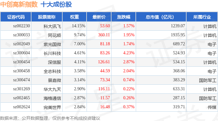 中创高新(399652)指数十大成份股详情如下: