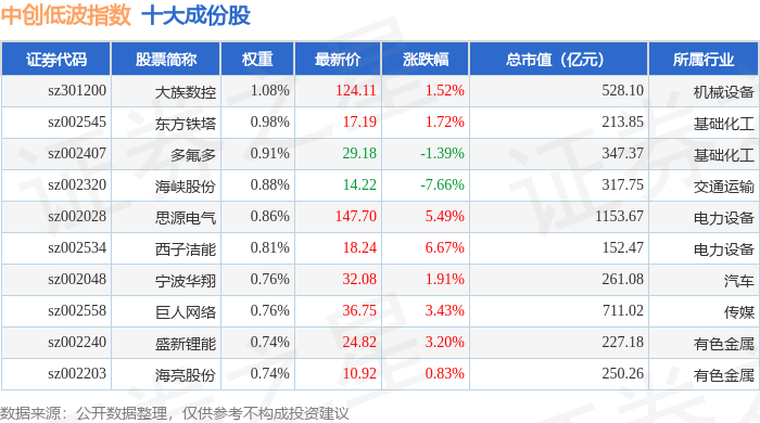 证券之星消息,11月6日,中创低波(399665)指数报收于2357.5点,涨1.17%,成交1280.19亿元,换手率1.58%。当日该指数成份股中,上涨的有143家,瑞丰新材以9.47%的涨幅领涨,下跌的有51家,海峡股份以7.66%的跌幅领跌。
