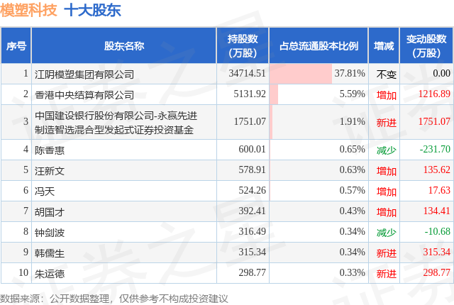 根据模塑科技2025年三季报公布的十大股东详情如下: