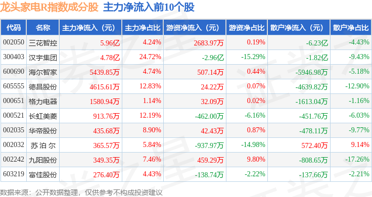 资金流向方面,龙头家电R(480028)指数成份股当日主力资金净流入合计11.1亿元,游资资金净流出合计1.82亿元,散户资金净流出合计9.28亿元。成份股资金流向详情见下表: